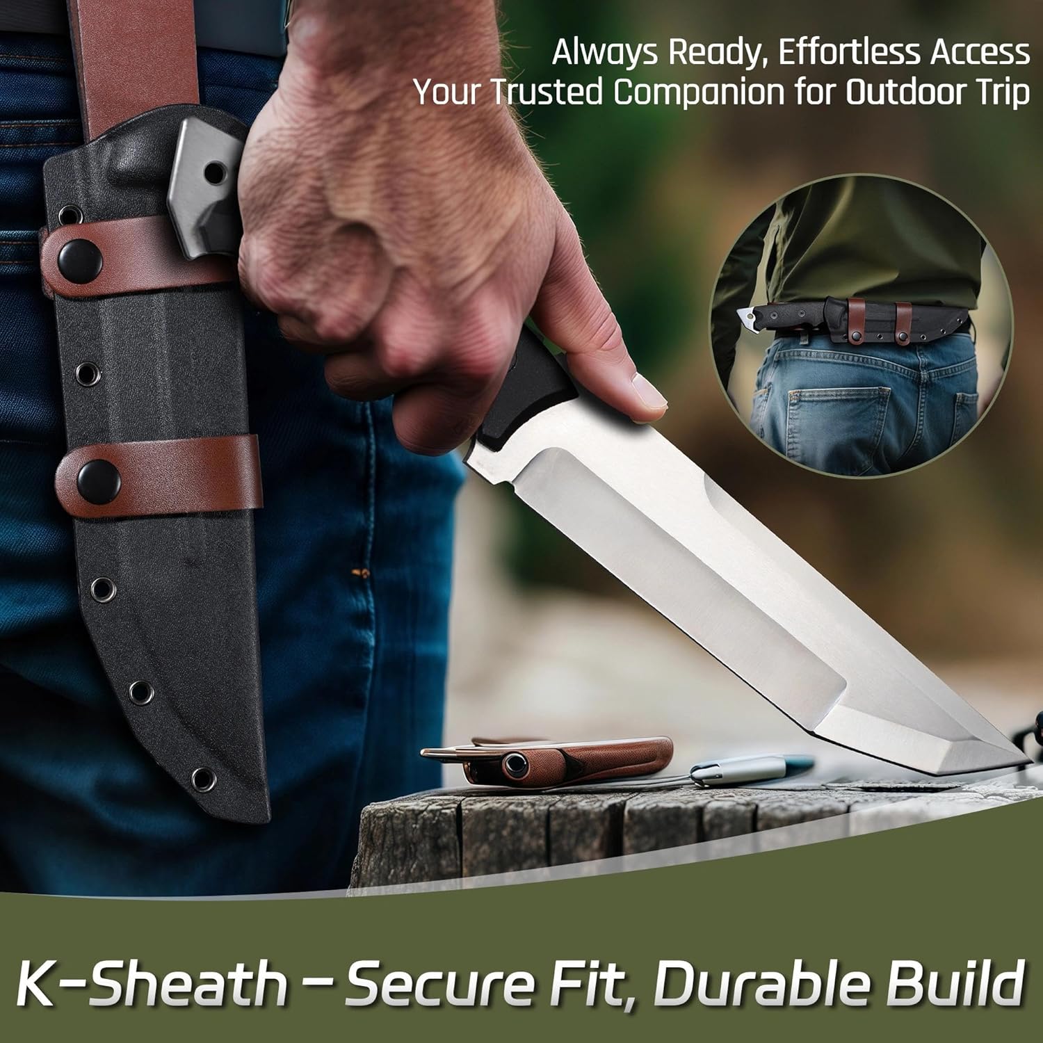 Full tang 14C28N steel with tactical tanto tip and sheath. Built for survival, camping, and combat utility.