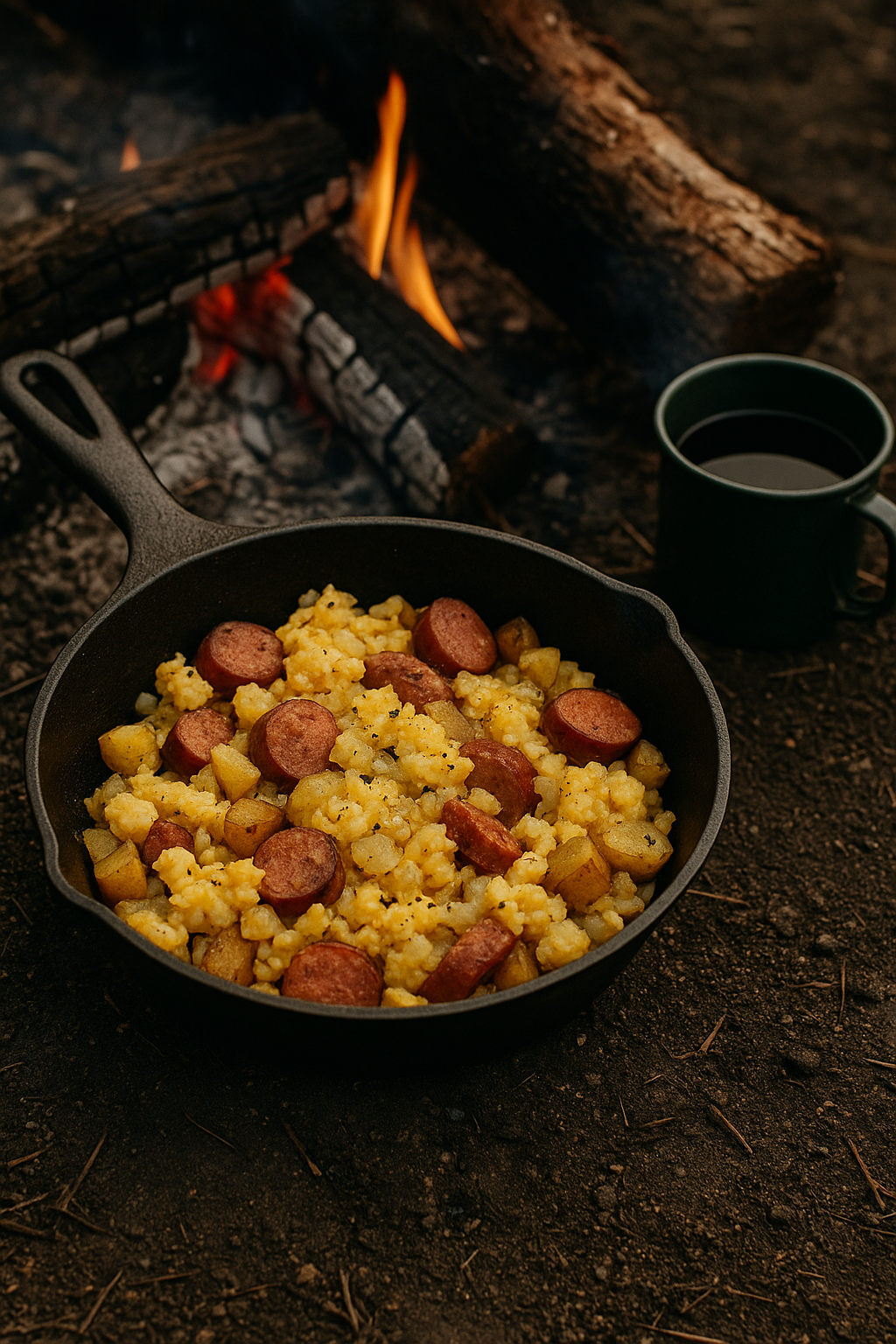 Everything good about breakfast mixed in one pan, sizzling beside the fire. The eggs cling to sausage and potatoes while smoke gives it a taste no kitchen can copy.